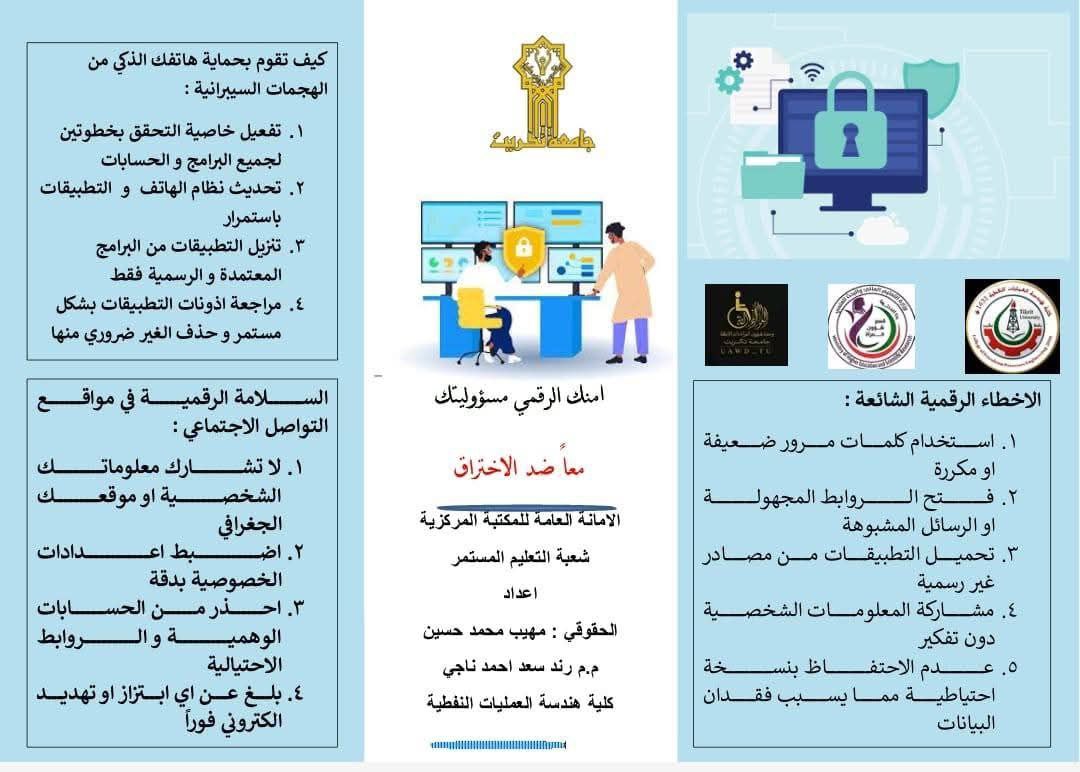 برعاية السيد رئيس جامعة تكريت الأستاذ الدكتور وعد محمود رؤوف المحترم وبإشراف الأستاذ المساعد الدكتور غسان حمد عبد الله عميد كلية هندسة العمليات النفطية... أقامت وحدة شؤون المرأة ذات الاعاقة_ شعبة شؤون المراة وبالشراكة مع كلية هندسة العمليات النفطية مثمثلة بعضوية الارتباط فيها وبالتعاون مع مركز التعليم المستمر والأمانة العامة للمكتبة المركزية في رئاسة الجامعة دورة بعنوان: (حوكمة أمن المعلومات ومخاطر الهجمات السيبرانية – الوعي – التهديدات – سبل الحماية) وذلك على مدى ثلاثة أيام الأحد والاثنين والأربعاء الموافق 4 – 5 – 7 / 1 / 2026.